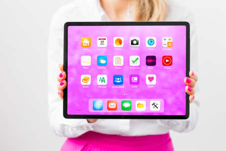 Paris, France - Apr 16, 2020: Woman looking on Apple Computers internet website on iPad Pro tablet in room environment showcasing new Lidar scanner