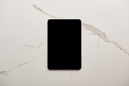 Top view of tablet on white marble surface