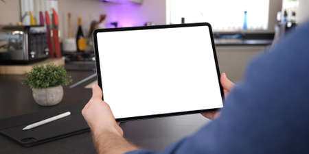 Cropped shot of young man using his blank screen digital tablet while sitting in comfortable room