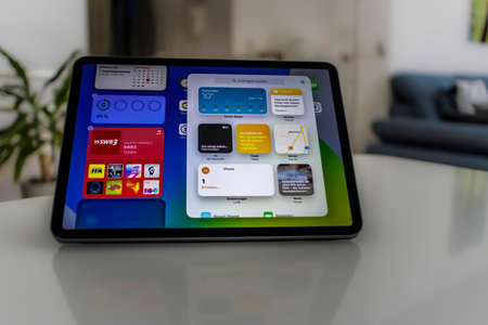 Alanya, Turkey - May 3, 2024: Tablet iPad Air IOS 17 with widget on the home screen. Tablet iPad was created and developed by the Apple inc.