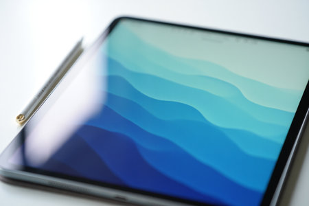A sleek transparent tablet rests on a rough concrete surface, its screen illuminated with soft, vibrant abstract shapes. The atmospheric lighting creates a serene and modern feel.