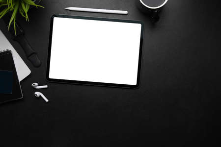 Overhead shot of blank screen digital tablet on black desk in dark luxury workspace