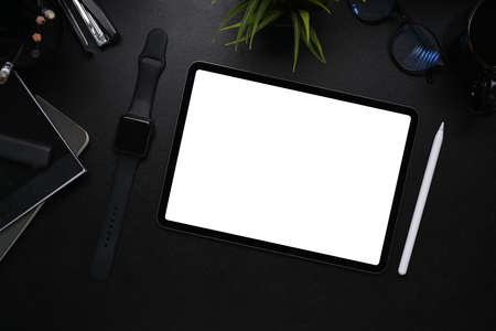 Top view of dark modern workplace with blank screen digital tablet with office supplies on black table background