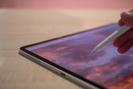 Photo retouching and drawing with a stylus on the screen of a modern graphic tablet. The authors hand edits a photo on a tablet, mobile photo editors