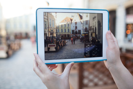 TALLINN, ESTONIA - APRIL 22, 2014: Close-up shot of womans hands using touchpad to make video or photo of ancient street in Tallin old city