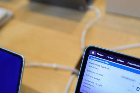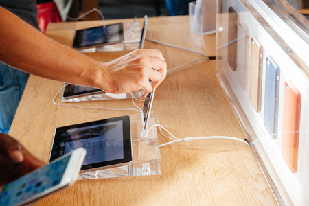 PARIS, FRANCE - SEPTEMBER 20, 2014: Customers admiring the new iPhone 6 and iPhone 6 Plus at the Apple Inc. store in Paris, France