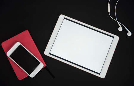 Digital tablet computer or touchpad and smartphone blank screen mockup on black background. top view