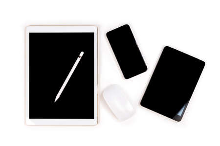 Office table with digital tablet, smartphone, mouse and pencil on isolated pure white background / Laptop and tablet mockup concept. (Selective Focus)