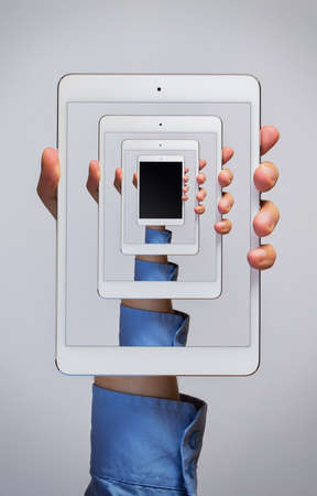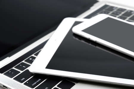 Collection of modern personal electronic devices: white smartphone, tablet and laptop in close-up