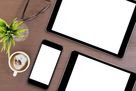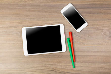 phone and tablet blank screen on table top view, mock up smart phone and digital tablet