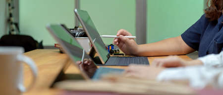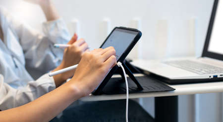 Close-up of hand asian student study using tablet computer and laptop study and do home work with friend at home, Concept education, working, meeting, and homework