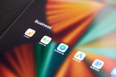 New york, USA - October 5 2021: Set of business apps on tablet screen close up view