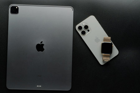 New York, USA - January 31, 2024: Apple ipad, watch and iphone 15 on black background above top close up view