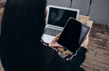 The girl working with a tablet computer. The graph rises. Table, wooden, background black