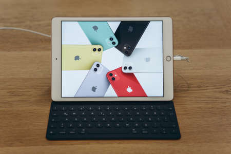 PARIS, FRANCE - NOV 7, 2018: Customer POV personal perspective experiencing new Apple iPad Pro with Face ID, A12X Bionic with Neural Engine and thin completely redesigned body - comapre 11 vs 12,9 inch