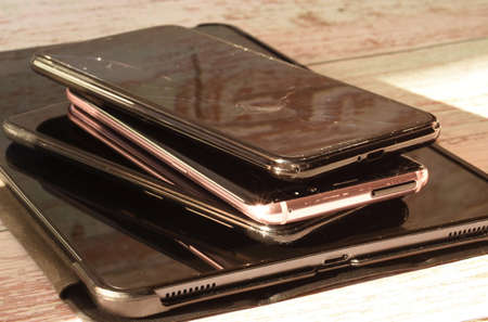 Apple watch, Ipad, iphone, airpods pro on the wooden table, May 2021, San Francisco, USA