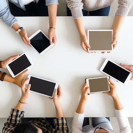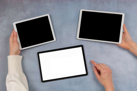 Top view to people using digital tablets computer. Mock up screen with clipping patch. Education, online learning, team working background