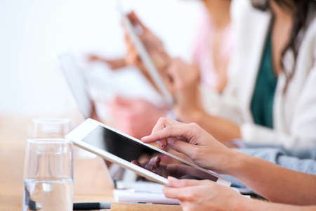 Touching our way towards business success. unrecognizable corporate businesspeople using different devices in an office.