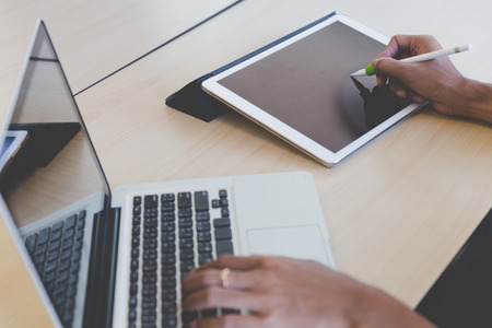 photographer retouching photo, graphic designer drawing image using a digital tablet, pen and computer laptop