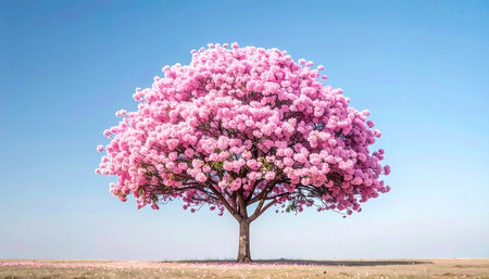 A solitary tree with a dense canopy of vibrant pink flowers stands against a clear blue sky in a dry landscape.