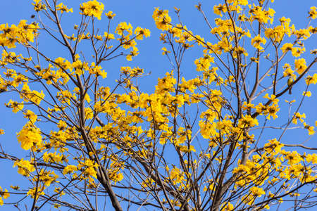 Blooming Guayacan or Handroanthus chrysanthus or Golden Bell Tree under blue sky.