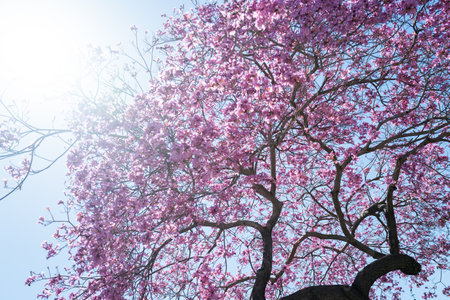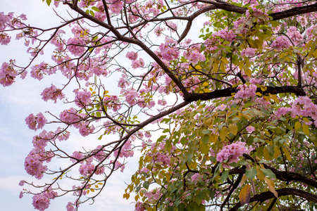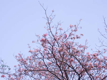 Pink tabebuia flower blossom against blue sky. Pink flower Chompoo Pantip blossom in Thailand, Thai sakura with sweet background, Background. Pink flower Chompoo Pantip blossom in Thailand