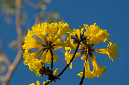 Bloom detail in yellow ipe tree with bright blue sky