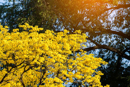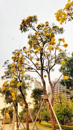Beautiful clusters of yellow flowering tree of Tabebuia Aurea
