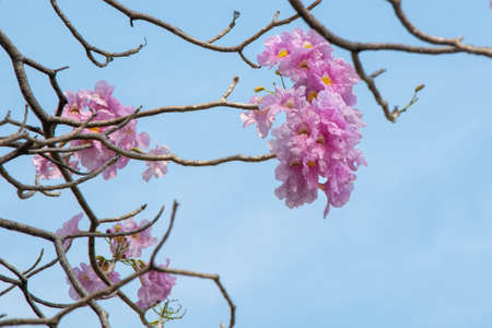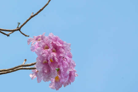 Pink flowers of Pink Tecoma or Rosy trumpet tree (Tabebuia rosea) on tree branch against light blue sky background.