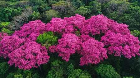 Aerial view of pink rhododendron flowers in the forest