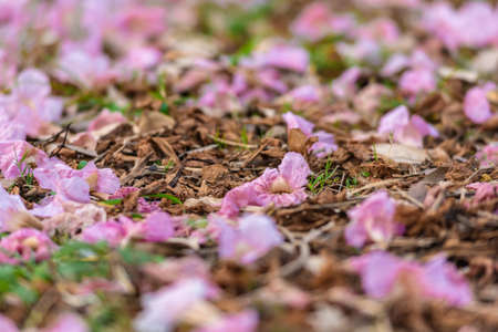 Pink trumpet tree flower in summer on ground, nature back ground