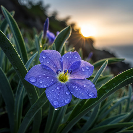 Beautiful blue flower with water drops on the petals at sunset