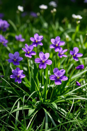 Pink flowers in green grass. Spring time.Violets in the flower bed. Sunny day.