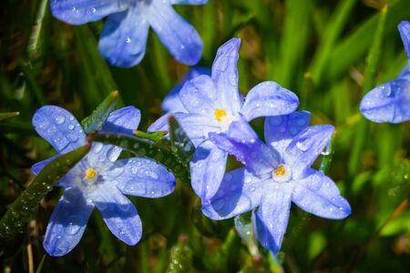 Closeup of blooming blue scilla luciliae flowers with raindrops in sunny day. First spring bulbous plants. Selective focus with bokeh effect.