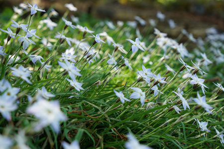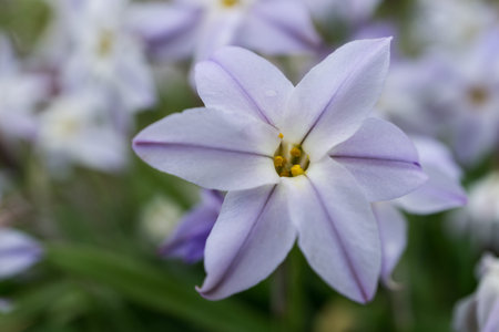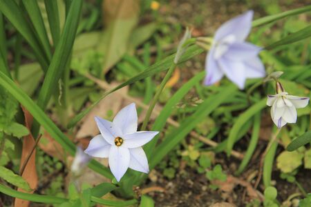 Spring star flowers. Amaryllidaceae bulbous plants. White and light purple 6-petaled star-shaped flowers bloom from March to May.