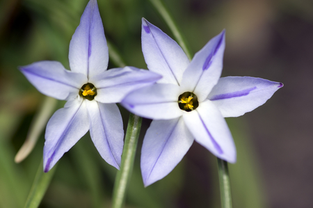 Ipheion uniflorum spring bulbous plants in bloom, two light blue white flowers