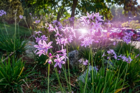 Delicate pink branches of wild garlic in landscape design on a lawn in the evening.