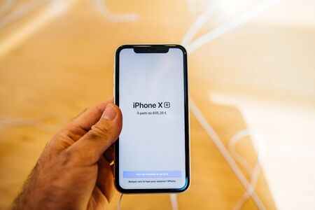 Paris, France - Mar 19 2019: Man POV personal perspective holding iPhone XS inside the new Apple Store Champs-Elysees - showing prices in Euros - French flagship store