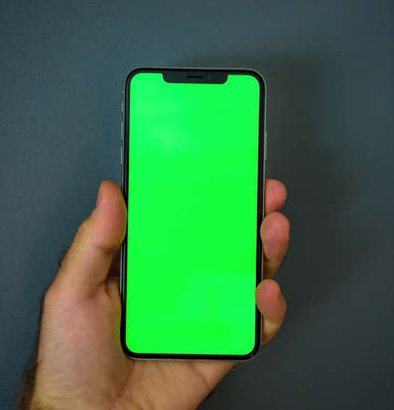 Male hand holding new smartphone telephone with green screen isolated on gray background