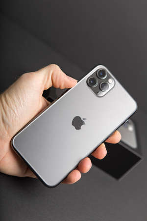 Milan, Italy - December 17, 2019: close up on a handheld brand new Apple iPhone 11 Pro on a black background.
