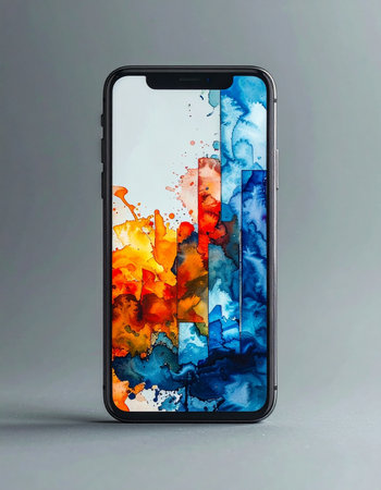 A modern smartphone stands against a minimalist gray background, its screen bursting to life with a dynamic splash of vibrant orange and cool blue ink.
