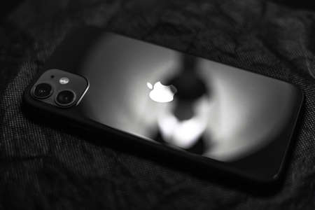 Moldova, Chisinau - 03.11.2019: Close-up of black iPhone 11 on dark textured background.