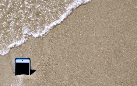 Woman hand with manicure holding white mobile phone with wave and sea in background.
