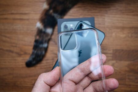Paris, France - Oct 4, 2019: POV of male hand holding the new Clear protection plastic case for the new Apple Computers iPhone 11 pro smartphone with cat tail on the table