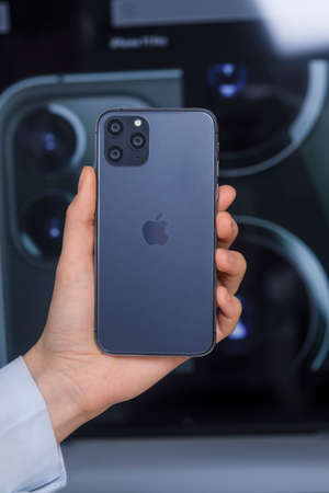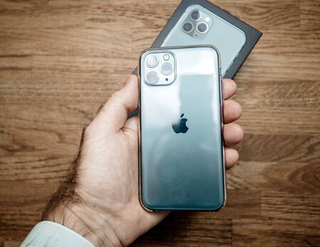 Minsk, Belarus - 11 December 2019 : Male hand hold Apple iphone pro Illustrative editorial