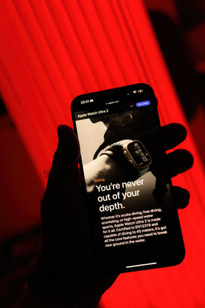 Paris, France - Sep 8, 2024: Male hand holding the iPhone 16 Pro Max displaying the new Apple Watch Ultra 2 in titanium, promoting its diving, snorkeling, and deep diving capabilities, certified EN13319 and capable of diving up to 40m, with a pre-order bu