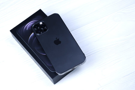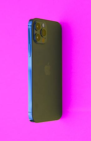 KHARKIV, UKRAINE - JANUARY 27, 2021: Apple Iphone 12 pro new brand model smartphone with IOS base on white background. Apple Inc. is an American technology company headquartered in California