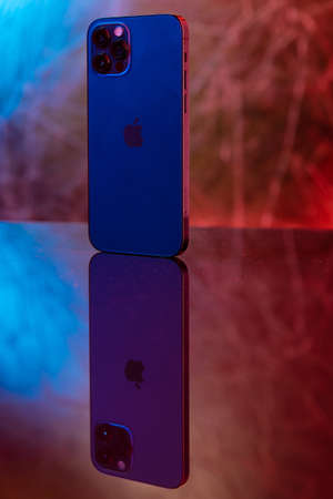 smartphone mockup iPhone 12 Pro Max with blank white screen on blue background, top view. Apple is a multinational technology company. Moscow, Russia - January 15, 2021