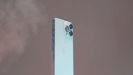 New York - USA, 10.11.2021: close up of a new Iphone 13 pro max with three cameras. Action. Steam spreading around a new silver smartphone rotating slowly isolated on a beige wall background.
