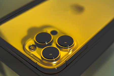 Nice, FRANCE - 13.12.2021: Selective focus. Apple iPhone 13 Pro Max on the box. The latest 5G smartphone model by Apple Computers. Blurred background